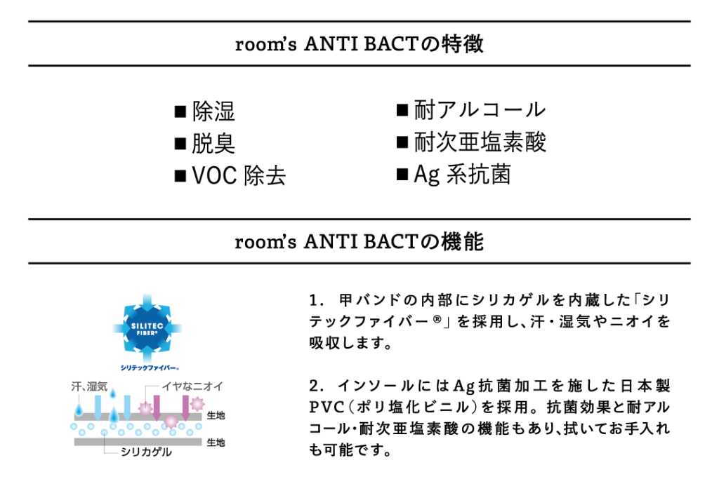 また、インソールにはAg抗菌加工された日本製PVCを使用。耐アルコールや耐次亜塩素酸の性能もあり、拭いてお手入れも可能です。